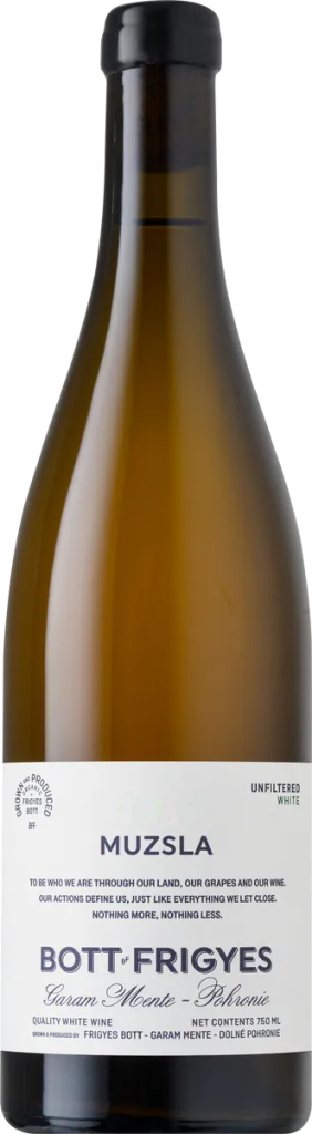 Bott Frigyes, Muzsla — сухое белое вино, созданное из купажа винограда сортов Рислинг, Пино Блан и Совиньон Блан, выращенных на собственных виноградниках хозяйства на почвах из андезитового и риолитового туфа в регионе Juznoslovenska. Ферментация в открытых чанах с мацерацией без контроля температуры. Выдержка на осадке 10 месяцев без батонажа: частично - в старых бочках, частично - в амфорах. Розлив без осветления и фильтрации.