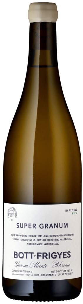 Bott Frigyes, Super Granum, White — сухое белое вино, созданное из купажа винограда сортов Пино Блан, Харшлевелю и Фурминт, выращенных на собственных виноградниках хозяйства на почвах из андезитового и риолитового туфа в регионе Juznoslovenska. Целые грозди, спонтанная ферментация. Выдержка на тонком осадке в дубовых бочках 11 месяцев. Розлив без фильтрации.