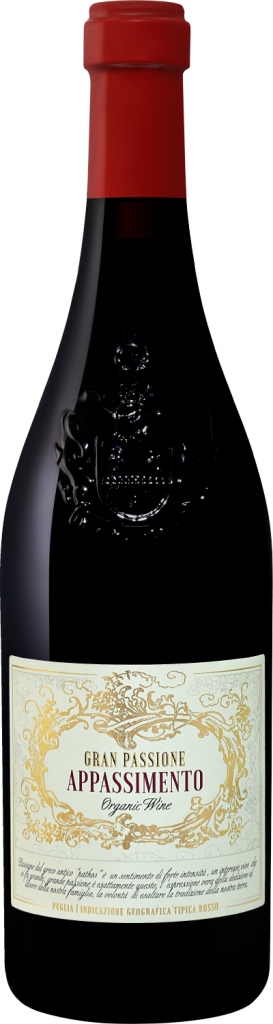 Gran Passione, Appassimento — красное полусухое вино, изготовленное из винограда сортов Негроамаро, Мерло и Примитиво, который выращивается в зоне Пулья. Виноградники расположены на участках, которые обрабатываются по принципам органического виноградарства. Виноград подсушивают на лозе на протяжении 15-20 дней, в течение этого периода испаряется 50% его веса и накапливаются сахара, а затем собирают подвяленные ягоды вручную. Сушка придает вину характерные нотки спелых фруктов и сухофруктов, таких как слива и изюм. На винодельне ягоды сортируются и мягко прессуются. Далее вино создается по традиционной для вин Амароне методике "аппассименто" с ферментацией при контролируемой температуре в стальных емкостях и длительной мацерацией на мезге. Затем вино помещается в дубовые бочки на 30 дней для завершения малолактической ферментации, что наделяет букет и вкус вина приятными нотками специй и ванили. "Гран Пассьоне" Аппассименто составит гармоничную пару красному и белому мясу, дичи и зрелым твердым сырам. Потенциал хранения вина составляет 3-5 лет.