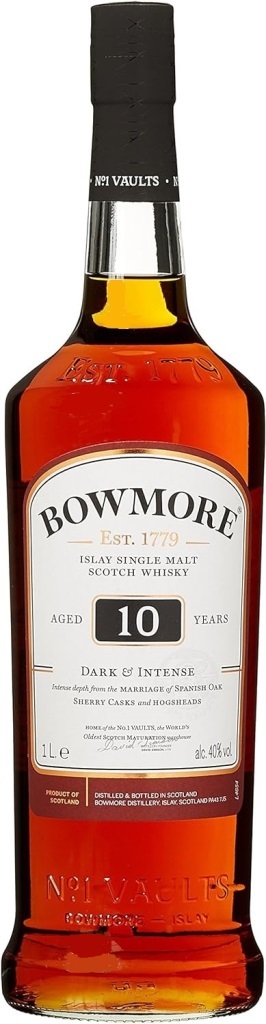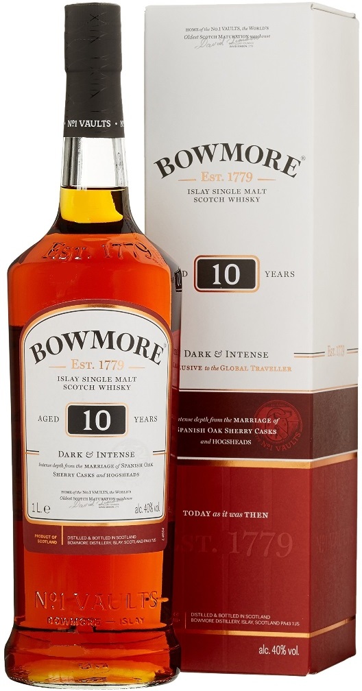 Bowmore, "Dark & ​​Intense" 10 Years Old, первоначально дебютировавший на рынке Travel Retail, представляет собой односолодовый виски, выдержанный на протяжении 10 лет в бочках из испанского дуба из-под хереса и хогсхедах. В результате такой выдержки получается добиться изящного баланса между классическими дымными тонами Айла и сладостью хересных нот. Именно испанские бочки из-под хереса раскрывают пряные ноты и фирменный торфяной дух. Не зря второе название 10-летнего Бомо "Темный и Интенсивный".