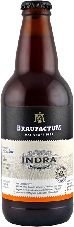 BraufactuM, Indra — интересный эксперимент пивоваров БрауфактуМ, сочетание немецкого пшеничного эля и ароматного американского ИПА. В аромате напитка переплетаются бананово-гвоздичные тона классического Вайцена и выразительные оттенки американского хмеля Каскад. Этот сорт был выбран для холодного охмеления благодаря мощным вкусовым характеристикам, способным составить идеальный контраст и баланс интенсивному вкусу пшеницы.