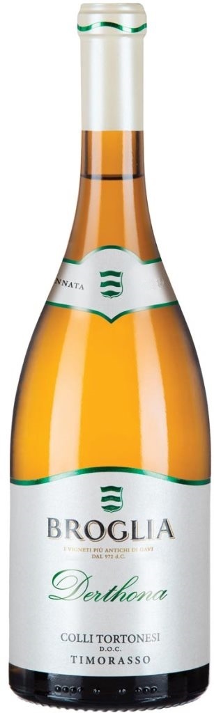 Broglia, "Derthona" Timorasso — свежее белое сухое вино из отборного редкого автохтонного винограда сорта Тиморассо, который выращивается только на холмах Тортоны. Собранный вручную виноград винифицируется исключительно в небольших стальных резервуарах. Выдержка на тонком осадке длится 18 месяцев. Такой подход к винификации и обработка в бутылке позволяют усилить лучшие характеристики Тиморассо, структуру и минеральность.