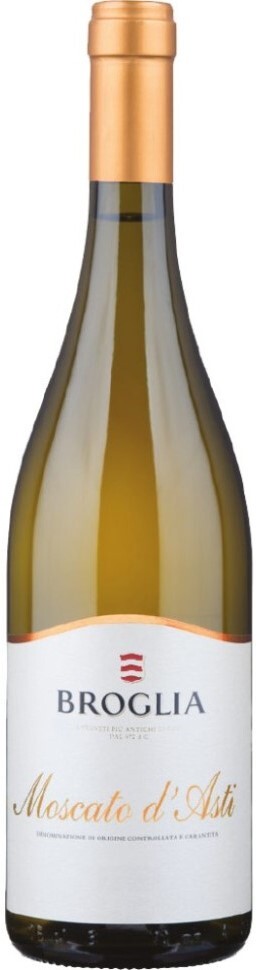 Broglia, Moscato d'Asti — нежное жемчужное вино из винограда сорта Москато, выращенного в холмистой местности, что гарантирует хорошие температурные диапазоны, способствующие созданию свежих и фруктовых ароматов. Виноградники расположены преимущественно на юго-восточных склонах с известковыми почвами, на высоте 150-300 метров над уровнем моря. После сбора виноград бережно прессуют, полученный сок охлаждают и ферментируют при контролируемой температуре. Вторичное брожение проходит в автоклавах в соответствии с методом Шарма. Когда уровень алкоголя достигает 5%, брожение останавливается путем резкого снижения температуры. Далее следует фильтрация и бутилирование. Затем игристое вино не менее 2-х месяцев "отдыхает" в бутылках. Благодаря высокому содержанию сахара и низкому содержанию алкоголя этот Москато сохраняет интенсивный аромат.