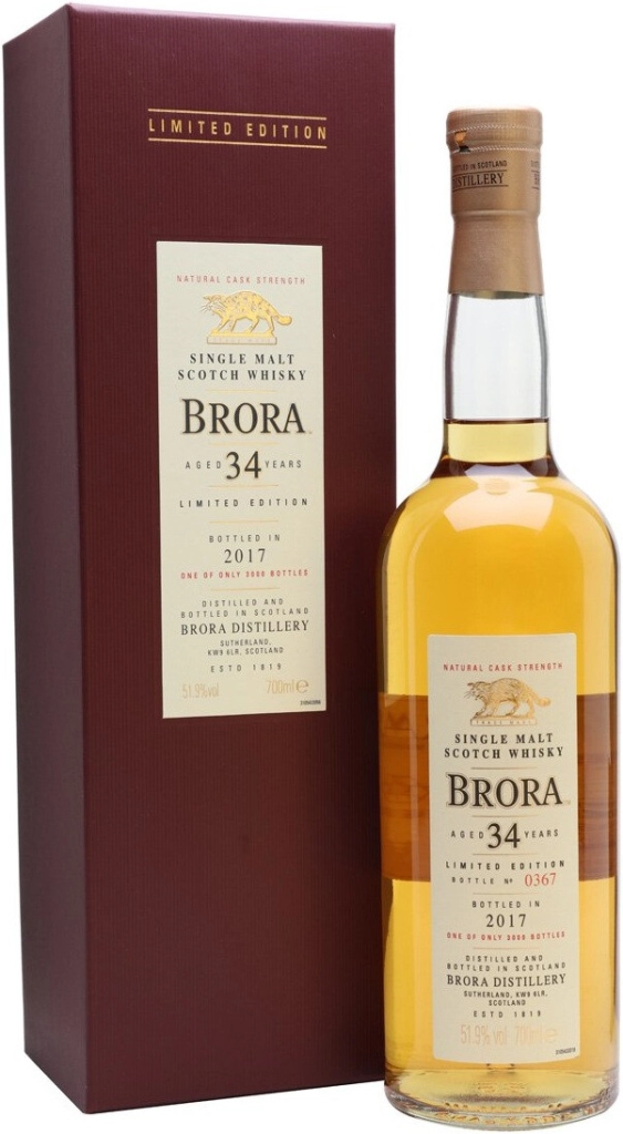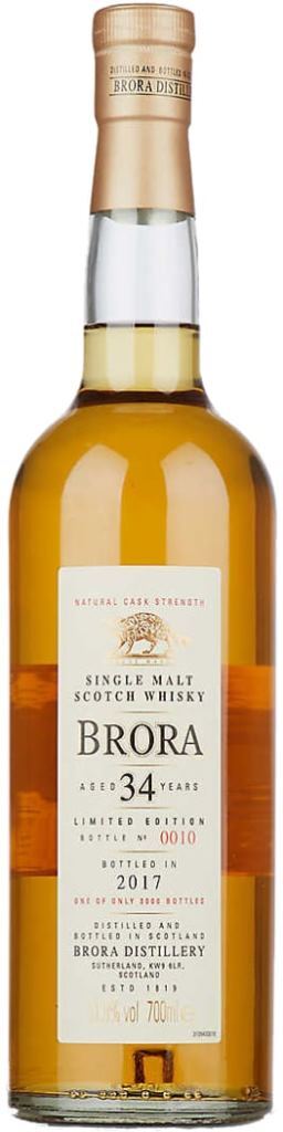 Brora, 34 Years Old — эксклюзивный релиз, выпущенный концерном Диаджео в ограниченном количестве в 2017 году. Виски был дистиллирован за год до закрытия винокурни Брора в 1983 году. К тому времени на винокурне использовалось гораздо меньше торфа, чем в предыдущее десятилетие, поэтому во вкусе и аромате виски преобладающими являются фруктовые тона, лишь слегка дополненные элегантными, мягкими нюансами дыма. Виски выдерживался более 34 лет в американских дубовых бочках повторного наполнения. Выпуск составил всего 3000 бутылок.