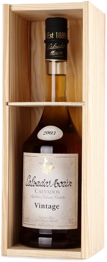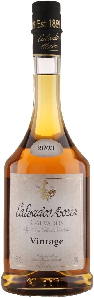 Calvados Morin, Vintage 2003 — винтажный кальвадос, таящий в себе богатство одного урожая, пронесенное через года. Кальвадос производят из смешанных в особых пропорциях горьких, сладко-горьких, кислых и сладких сортов яблок. Влажный океанический климат Нормандии идеален для выращивания яблок, из которых получают сидры, используемые затем для изготовления кальвадоса. Благодаря разнообразию сортов кальвадос приобретает неповторимый вкус. Дистиллированные в 2003 году молодые коньячные спирты созревали сначала в старых бочках из-под сидра, затем дубовых бочках, обожжённых в центральной Франции, и еще не менее 6 месяцев в бочках из-под Сотерна. Кальвадос созревал около 17 лет, постепенно развивая тонкие ароматы и красивый янтарный цвет. Уникальная среда погребов играет большую роль в развитии кальвадоса. Длинные галереи, высеченные в меловых холмах долины Эр, уходят глубоко в скалы. Очень влажная атмосфера этого места идеально подходит для выдержки кальвадоса в тишине и защите от городских вибраций. Влажность окружающей среды, близкая к 100%, дает более эластичные и гармоничные коньячные спирты.