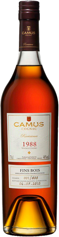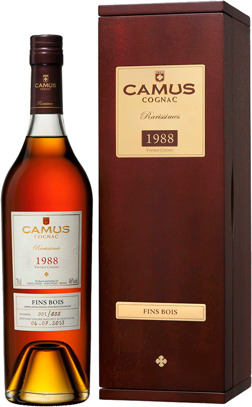 Camus, Vintage, 1988 — роскошный коньяк, дистилированный в перегонных кубах "шарантского" типа объемом 2500 л. Выдержка коньяка проводилась в дубовых бочках в погребах коньячного дома и длилась 25 лет. Упакованный в элегантную деревянную коробку, этот коньяк станет настоящим украшением в коллекции ценителя крепких напитков.