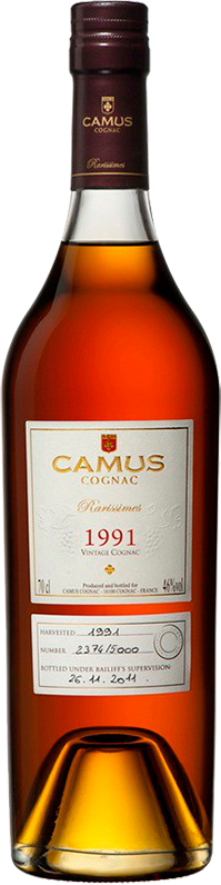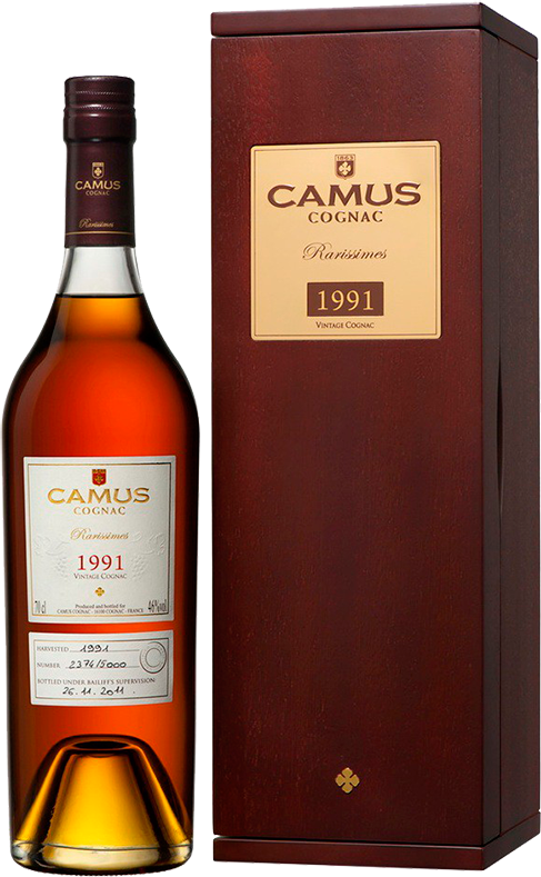 Camus, Vintage, 1991 — винтажный коньяк, который был создан из одного из самых скудных урожаев в истории дома Камю. Экстремально холодная весна с температурой -4,2 °С заморозила около 60% будущего урожая. Несмотря на это, теплое лето позволило доспеть ягодам, насытив их необычайно элегантной кислотностью. Выдержка коньяка проводилась в дубовых бочках в погребах коньячного дома и длилась 20 лет. Упакованный в элегантную деревянную коробку, этот коньяк станет настоящим украшением в коллекции ценителя крепких напитков.