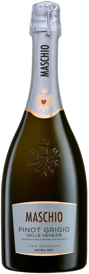 Cantine Maschio, Pinot Grigio delle Venezie Extra Dry — изысканное белое игристое вино, созданное из отборного винограда сорта Пино Гриджио. Урожай собирается с лучших виноградников в Венето и Фриули в степени полной зрелости и сразу же подвергается прессованию с использованием пневматических прессов. Полученное таким образом сусло ферментируется в стальных емкостях при контролируемой температуре с использованием отобранных дрожжей. Вторичная ферментация проходит в автоклаве. Пино Гриджио идеально подходит для дегустации изысканных закусок, хорошо сочетается с блюдами из рыбы и белого мяса.