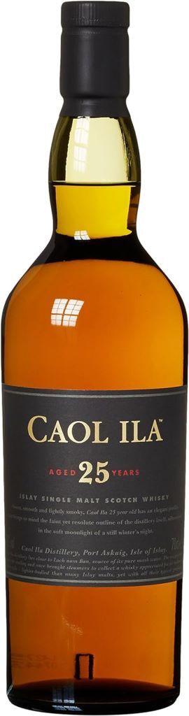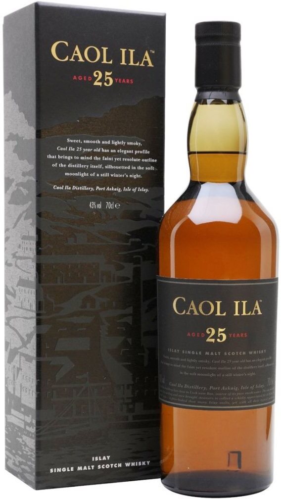 Caol Ila, 25 Years Old — превосходный, зрелый, богатый односолодовый виски с острова Айла, который в 2004-2005 годах разливался при бочковой крепости, а с 2010 года выпускается при крепости в 43%. Интересно, что во вкусе и аромате виски характерные островные тона — торфа, дыма, угля — безусловно присутствуют, но не подавляют сладкие фруктовые оттенки. Созревание виски в течение 25 лет проходило в хогсхедах из американского дуба.