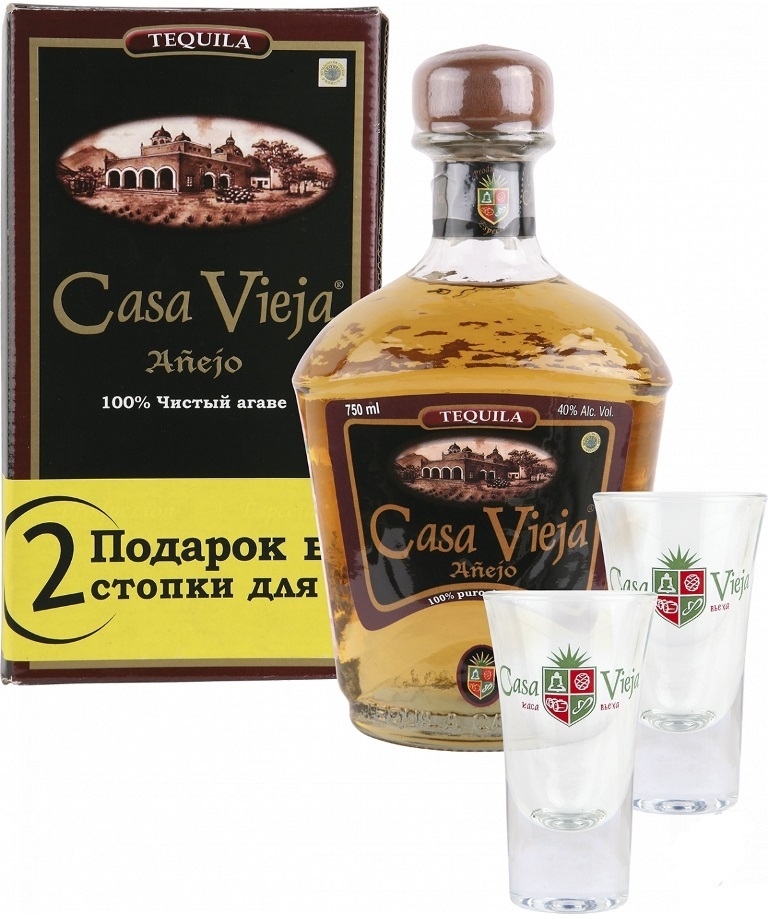 Текила Casa Vieja, Anejo, with 2 glasses in gift box, 0.75 л.