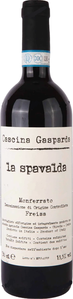 Cascina Gasparda, La Spavalda, Monferrato — оригинальное красное вино с яркой индивидуальностью и минеральным характером, изготовленное из винограда сорта Фрейза, который выращивается органическими методами на виноградниках поместья в Оливоле в долине Генза. Урожай собирается исключительно вручную по достижении ягодами оптимальной спелости. Спонтанная ферментация с натуральными дрожжами и 15-дневная мацерация протекают без контроля температуры. По завершении 18-месячной выдержки вино разливается в бутылки, в которых дозревает еще 1 год.