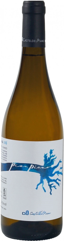 Castel del Piano, "Pian Piano" Toscana — натуральное белое вино, произведенное по принципам биодинамики. Купаж вина представляют сорта Дурелло, Пино Гриджио и Шардоне. Свежие травяные ароматы Дурелло гармонично сочетаются с фруктовыми и цветочными оттенками Пино Гриджио и Шардоне, создавая изысканное "Пьян Пьяно". Виноград выращивается в Луниджане, Тоскане, в 120 км от Лигурийского моря и у подножия Апеннин, примерно на высоте 200 метров над уровнем моря, на аллювиальных почвах с большим количеством песка, песчаника и речной гальки. Виноград собирается вручную. Натуральное вино должно быть зеркалом территории, так считают в Кастель дель Пьяно, поэтому при винификации используются только эндогенные дрожжи и небольшое количество сульфитов, не добавляются другие энологические продукты. Название вина переводится как "медленно". Это намек, что при изготовлении вина не следует спешить. "Pian Piano" покидает погреб после года выдержки на дрожжевом осадке и длительного дозревания в бутылке.