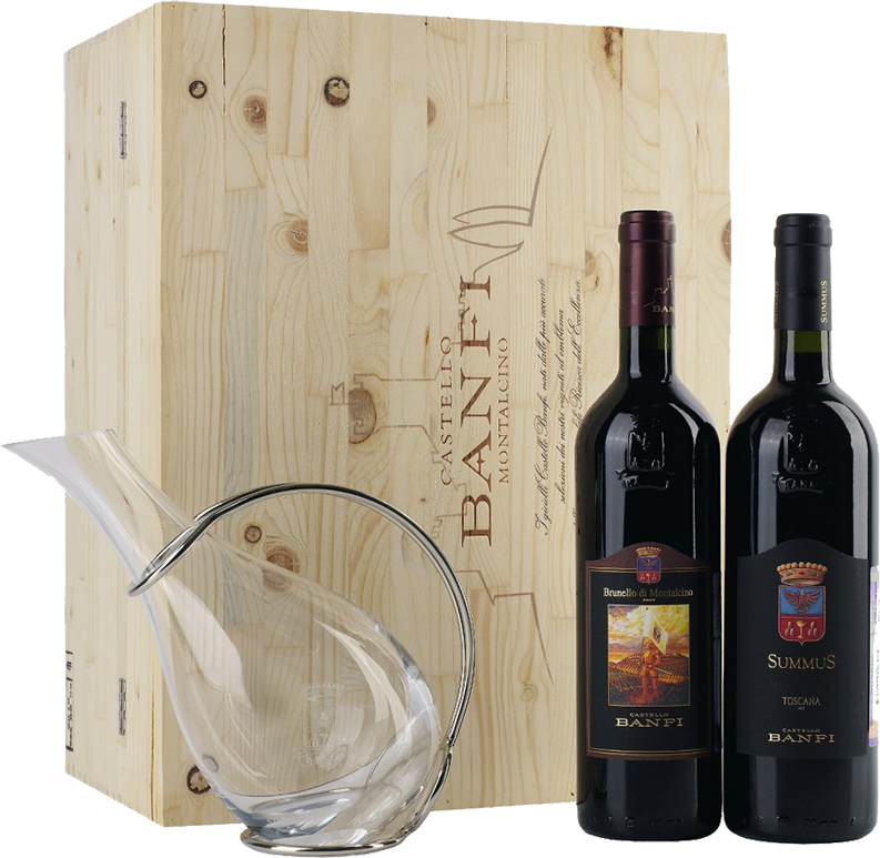 В элегантном наборе от Castello Banfi представлены две бутылки замечательного итальянского вина из региона Тоскана — Brunello di Montalcino и SummuS. В комплект также входит декантер оригинальной формы, с помощью которого вино раскроет свои лучшие вкусовые качества. Набор, оформленный в фирменный футляр из натурального дерева, станет замечательным подарком близким людям на любое торжество.