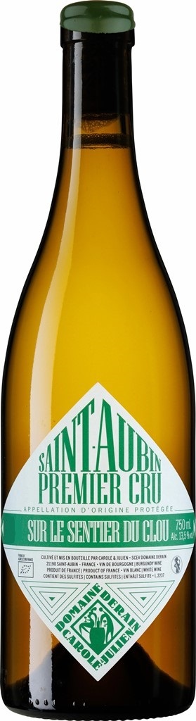 Domaine Derain, Saint-Aubin 1er Cru "Sur le Sentier du Clou" AOC — биодинамическое белое вино, созданное из отборного винограда сорта Шардоне, который выращивается на винограднике "Sur le Sentier du Clou" класса Премье Крю. Этот крошечный участок площадью всего 0,2 га имеет южную экспозицию, что позволяет максимально выразить живость и ароматическое богатство. Сбор урожая проводится исключительно вручную, на винодельне плоды подвергаются мягкому прессованию с последующей естественной ферментацией, протекающей в старых дубовых бочках. В этих же бочках проводятся яблочное-молочное брожение и выдержка вина на протяжении 12-14 месяцев. Перед бутилированием вино не фильтруется. За полчаса до подачи вино рекомендуется декантировать.