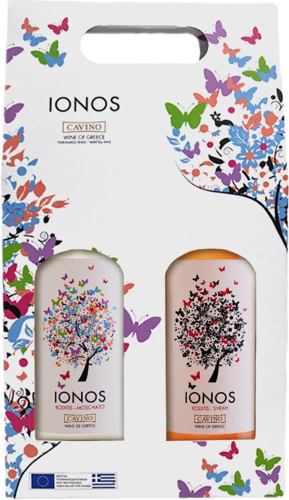 Набор включает в себя одну бутылку вина "Ionos" White и одну бутылку вина "Ionos" Rose.