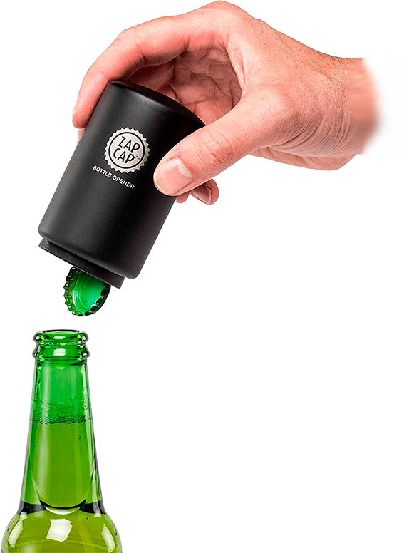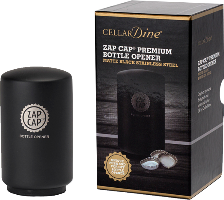 CellarDine, Zap Cap, Premium Bottle Opener — аксессуар, который позволяет легко и эффектно открыть бутылку с пивом или другим напитком. Выполненный из матовой черной нержавеющей стали, он имеет компактные размеры и отличается простотой применения. Достаточно надеть открыватель на горлышко бутылки и нажать. Специальный пружинный механизм без труда снимет крышку. Аксессуар можно рекомендовать для домашнего применения и в качестве презента близким людям.