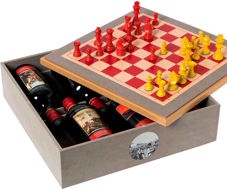 Вино, искусство и шахматы — эти три увлечения предпринимателя нашли свое воплощение в форме оригинальной упаковки, содержащей шесть бутылок Art Russe Saint-Émilion Grand Cru. Открыв ее, вы будете приятно удивлены: внутри вас ждет подарок — набор шахмат, а оборотная сторона крышки оказывается шахматной доской. Красный и бежевый цвет шахматных полей отвечает старинной русской традиции. Связь с шато в этом элегантном и неожиданном решении прослеживается благодаря использованному при изготовлении дереву, а также сдержанности дизайна.
