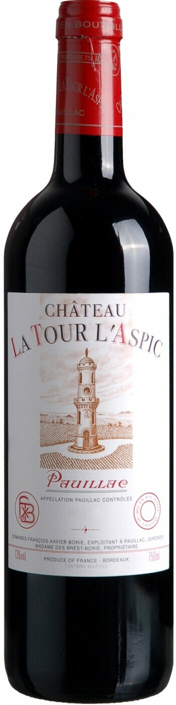 Пленительное вино "Chateau La Tour l’Aspic" является достойным представителем вин Пойяка, это второе вино Шато О-Батайе. Виноград двух сортов собирается с молодых лоз, оформленных по системе гюйо, после ферментации выдерживается в деревянных бочках. Вино отличается глубоким темным цветом и насыщенным фруктовым вкусом с шелковистыми танинами и мягкими древесными нотками. Шато Ля Тур л’Аспик обладает хорошим потенциалом старения.