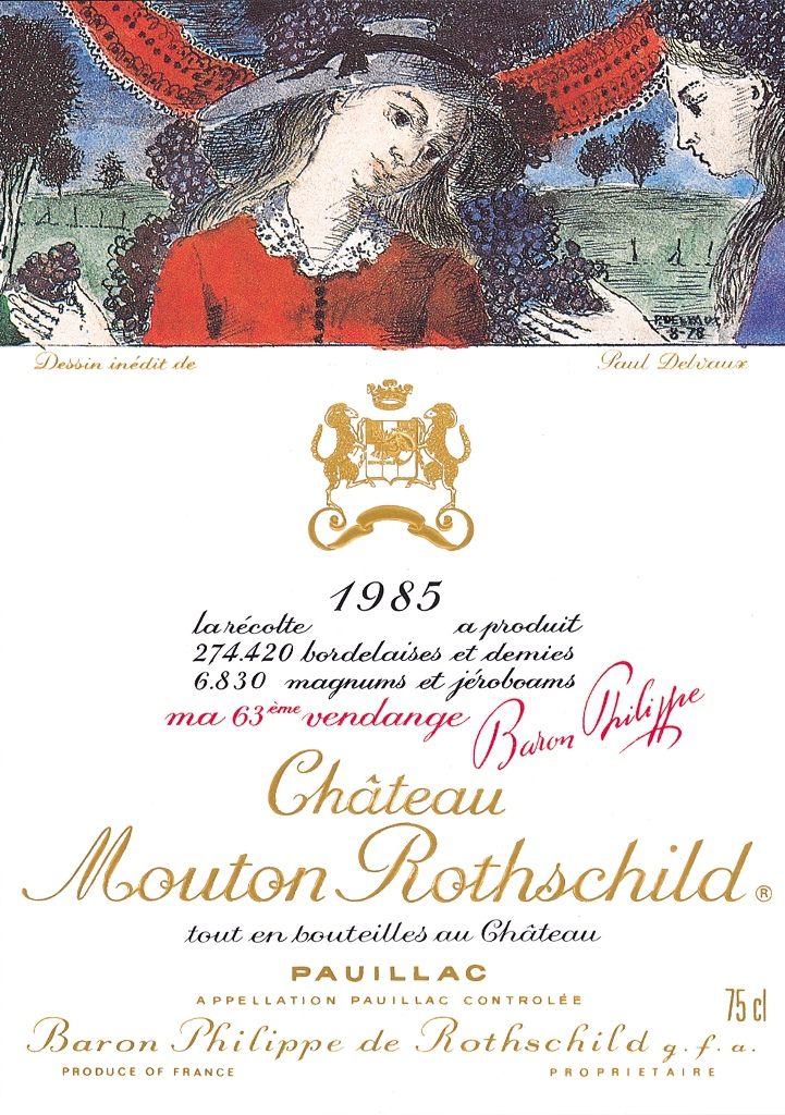 Шато Мутон Ротшильд, 1985 — роскошное вино, которое только сейчас начинает показывать признаки зрелости. Три бутылки из этого винтажа в настоящее время представлены на знаменитом аукционе Кристис. На этикетке 1985 года представлена работа бельгийского художника Поля Дельво (1897-1994), мастера современного искусства. Две девочки на рисунке для этикетки вина любуются гроздью винограда, готовясь в ближайшее время попробовать ее. Потенциал хранения винтажа составляет 40 и более лет.