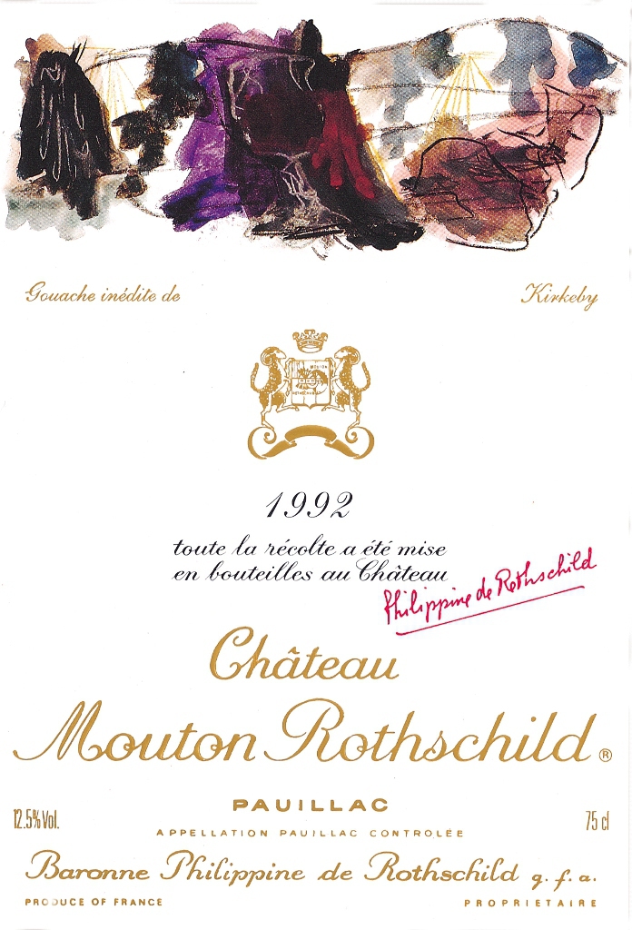 Шато Мутон Ротшильд, 1992 — роскошное вино, которое только сейчас начинает показывать признаки зрелости. Этикетку для этого винтажа нарисовал известный художник Per Kirkeby, родившийся в Копенгагене в 1938 году. На ней изображены очертания гигантского бокала, переполненные темно-красным вином. Напротив — искаженный ландшафт, в котором лучи солнца сплетаются с лозами.