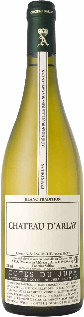 Сухое вино Chateau d'Arlay, Blanc "Tradition" — это классический и по-хорошему старомодный образец белых вин региона Cotes du Jura. Кюве на одну треть состоит из ягод Саваньена и на две трети — из плодов Шардоне, которые ферментируются вместе. Виноград собирают с низкоурожайных лоз, выращенных по принципам органического земледелия. Выдержка на протяжении 3,5 лет производится в старых дубовых бочках, которые полностью заполнены, что препятствует образованию дрожжевого слоя. Тем не менее винтаж отличается большей оксидативностью, чем купажи предыдущих лет.