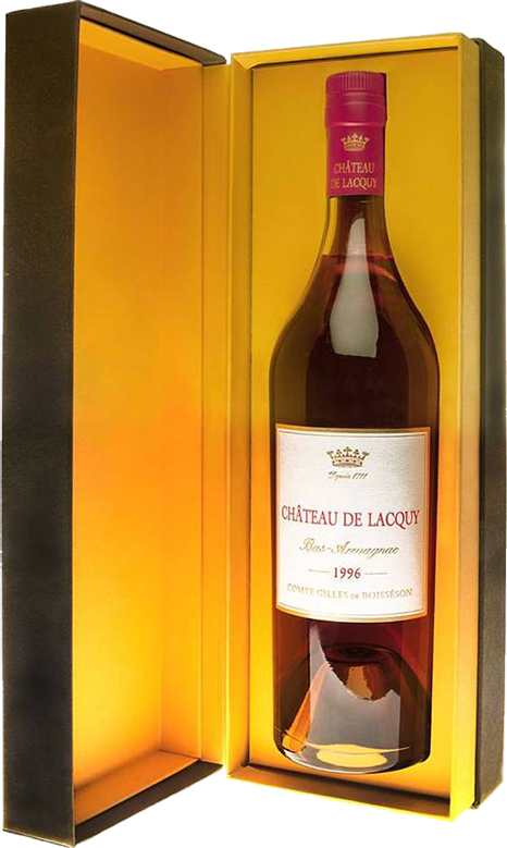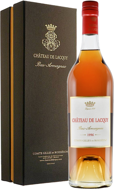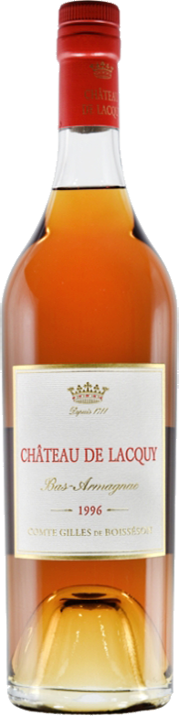 Bas-Armagnac du Chateau de Lacquy, 1996 — превосходно сбалансированный, мягкий, легко пьющийся, классический миллезимный арманьяк, созданный из винограда сортов Уни Блан (20%), и Бако (80%). Виноград дистиллируется в начале декабря, через 30-40 дней после сбора урожая, в собственных перегонных кубах хозяйства при температуре 52°С и разливается в подвалах Шато де Лаки в 400-литровые дубовые бочки для последующей выдержки. Погреба для выдержки в Шато де Лаки являются одними из старейших и лучших в регионе. При производстве арманьяка не используются красители и добавки.