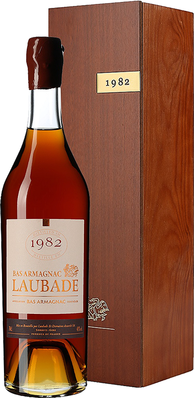 Основные сорта винограда для ассамбляжа "Chateau de Laubade 1982" — Уни Блан и Бако, выращенные в Нижнем Арманьяке. Это арманьяк урожая исключительно 1982 года. Выдержка арманьяка — в бочках до даты бутилирования, указанной на контрэтикетке. Арманьяк 1982 года — великолепный напиток с удивительным душистым ароматом и сбалансированным изысканным вкусом. Арманьяк представлен в красивой деревянной коробке, которая подчеркивает его изысканность.