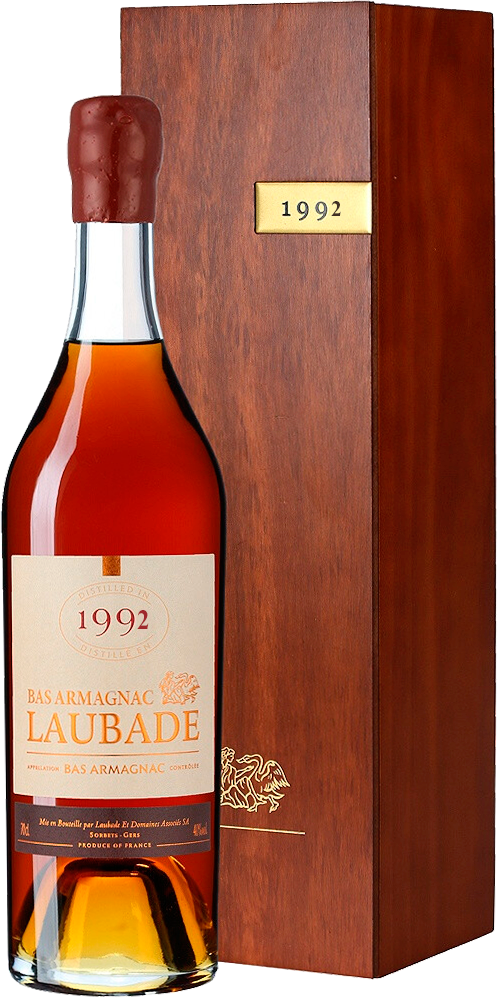 Основные сорта винограда для ассамбляжа Chateau de Laubade, 1992 — Уни Блан и Бако, выращенные в Нижнем Арманьяке. Это арманьяк урожая исключительно 1992 года. Выдержка арманьяка — в бочках до даты бутилирования, указанной на контрэтикетке. Арманьяк 1992 года — великолепный напиток с удивительным, сложным ароматом и щедрым, роскошным вкусом. Арманьяк представлен в красивой деревянной коробке, которая подчеркивает его изысканность.