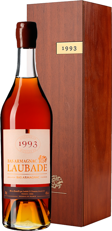 Основные сорта винограда для ассамбляжа Chateau de Laubade, 1993 — Уни Блан и Бако, выращенные в Нижнем Арманьяке. Это арманьяк урожая исключительно 1993 года. Выдержка арманьяка — в бочках до даты бутилирования, указанной на контрэтикетке. Арманьяк 1993 года — великолепный напиток с удивительным насыщенным ароматом и сбалансированным изысканным вкусом. Арманьяк представлен в красивой деревянной коробке, которая подчеркивает его изысканность.