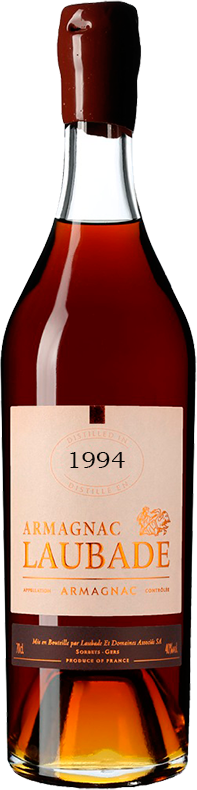 Основные сорта винограда для ассамбляжа Chateau de Laubade, 1994 — Уни Блан и Бако, выращенные в Нижнем Арманьяке. Это арманьяк урожая исключительно 1994 года. Выдержка арманьяка — в бочках до даты бутилирования, указанной на контрэтикетке. Арманьяк 1994 года — великолепный напиток с соблазнительным ароматом и сбогатым вкусом. Арманьяк представлен в красивой деревянной коробке, которая подчеркивает его изысканность.