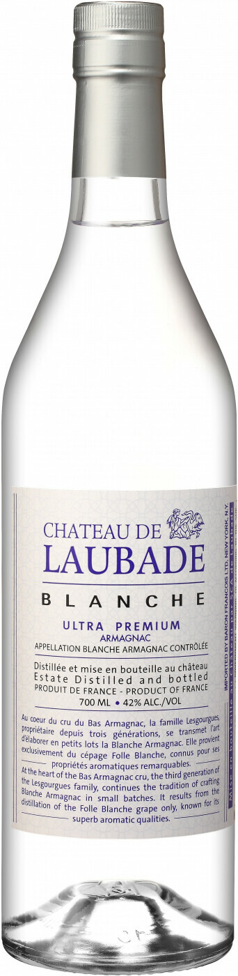 Арманьяк Chateau de Laubade, Blanche, Armagnac AOC изготавливается из винограда сорта Фоль Бланш, который придает ему интенсивный, свежий аромат и цветочно-фруктовый букет. Базовое вино дистиллируют в специальных перегонных кубах, используемых в регионе Арманьяк. Напиток не выдерживают в дубовых бочках, а оставляют на 3 месяца в стеклянных емкостях и резервуарах из нержавеющей стали.