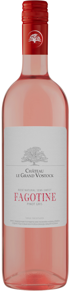 Chateau le Grand Vostock, Fagotine, Pinot Gris — яркое, сочное розовое вино с деликатной фруктовой сладостью, взрывная фруктовая новинка от Шато ле Гран Восток. Для создания вина производитель использует виноград сорта Пино Гри с собственных виноградников. Сбор урожая проводится исключительно вручную, что позволяет минимизировать повреждения ягод. Дата сбора определяется по достижении ягодами необходимого уровня сахаристости и кислотности. Примечательно, что винификация этого розового вина включает принудительную остановку брожения до его завершения. Именно так сохраняется его природная сладость. В то время как при создании других полусладких вин, применяется подслащивание концентрированным виноградным суслом. Ограниченный тираж насчитывает всего 7000 бутылок.