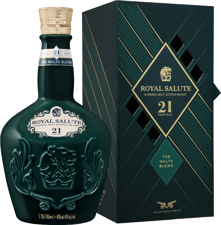 Royal Salute, 21 Years Old, The Malts Blend — напиток исключительной редкости, представляющий собой бленд из наиболее редких и эксклюзивных сортов шотландских виски, возраст каждого из которых составляет не менее 21 года. Назван в честь традиционного салюта из 21 залпа, которым отмечаются особые государственные и королевские события. "Роял Салют" впервые был представлен на рынке 2 июня 1953 года в честь коронации Ее Величества Королевы Елизаветы Второй. Во время коронации корона Елизаветы II была украшена сапфирами, рубинами и изумрудами. Именно оттенки этих драгоценных камней определяют цвет бутылок виски "Роял Салют", которые представляют собой роскошные графины ручной работы. Уникальные графины для виски сделаны из фарфора, производимого на британской мануфактуре Wade Ceramics. Первый же графин 1953 года был выпущен фабрикой Royal Doulton.