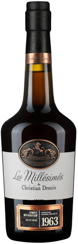 Christian Drouin, Calvados Pays d'Auge, 1963 — великолепный французский кальвадос из Нормандии, обладающий глубоким, вязким ароматом и прочным, длительным вкусом. Миллезимный кальвадос — это напиток определенного года дистилляции. Кальвадос 1963 года изготовлен путем двойной дистилляции в медном аламбике из яблок, выращенных в Пей д'Ож. Длительная выдержка кадьвадоса проходила в дубовых бочках их-под кальвадоса, а финишная выдержка — в бочках из-под Сотерна.