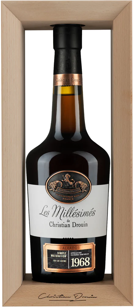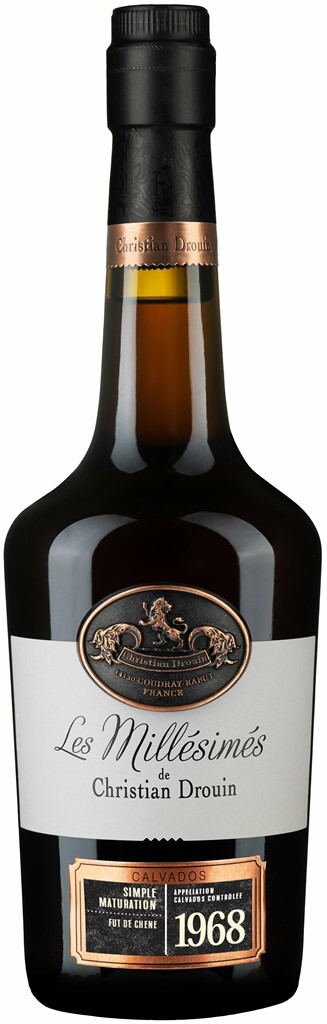 Christian Drouin, Calvados Pays d'Auge, 1968 — великолепный французский кальвадос из Нормандии, обладающий глубоким, вязким ароматом и прочным, длительным вкусом. Миллезимный кальвадос — это напиток определенного года дистилляции. Кальвадос 1968 года изготовлен путем двойной дистилляции в медном аламбике из яблок, выращенных в Пей д'Ож. Длительная выдержка кадьвадоса проходила в дубовых бочках их-под кальвадоса, а финишная выдержка — в бочках из-под Сотерна.