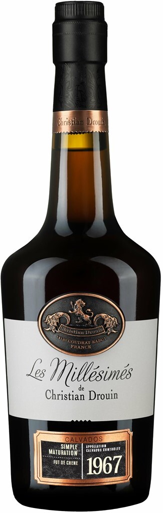 Christian Drouin, Calvados Pays d'Auge, 1967 — великолепный французский кальвадос из Нормандии. Миллезимный кальвадос — это напиток определенного года дистилляции. Кальвадос 1967 года изготовлен путем одинарной дистилляции в медном аламбике из яблок, выращенных в Пей д'Ож. Длительная выдержка кадьвадоса проходила в старый французских дубовых бочках.