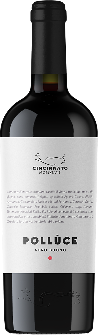Cincinnato, Polluce, Nero Buono, Lazio — красное сухое вино, изготовленное из винограда сорта Неро Буоно, который произрастает на виноградниках компании в регионе Лацио. Неро Буоно — древний сорт винограда с вековыми традициями, который был восстановлен и получил новую жизнь благодаря исследованиям и экспериментам. Виноградники расположены на холмистой, хорошо вентилируемой южной стороне Кори, на высоте 100-200 м над уровнем моря. Почвы вулканическо-глинистые. Вино названо в честь одного из мифических диоскуров, почитаемых в древнем храме Кастора и Поллукса, чьи внушительные руины находятся среди археологических сокровищ Кори.