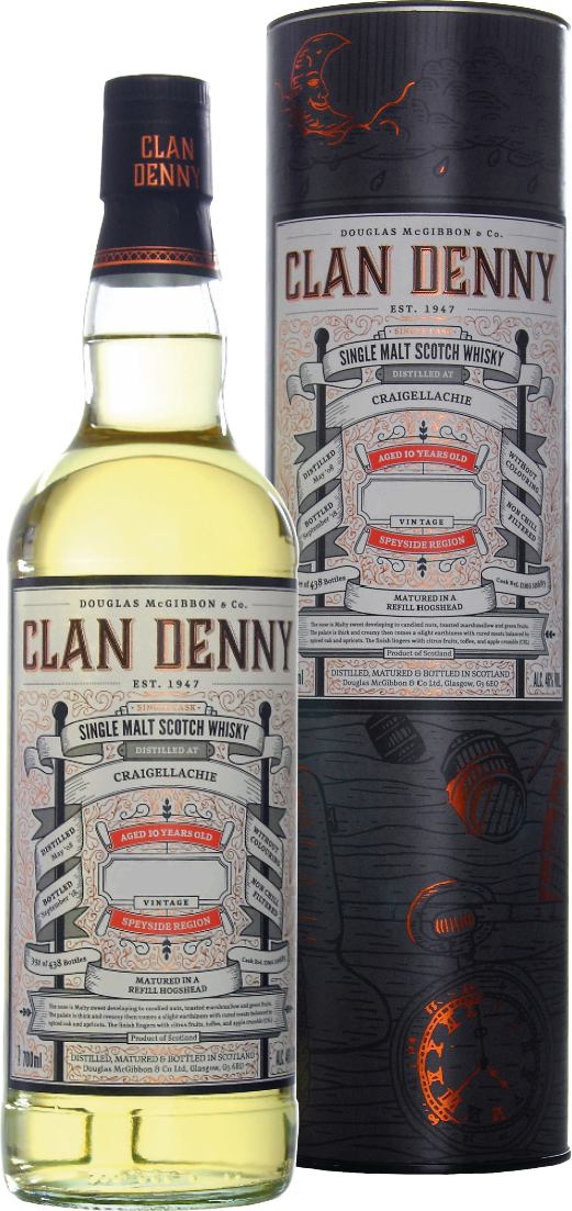 Clan Denny, Craigellachie — односолодовый шотландский виски из Спейсайда, выдержанный в одной дубовой бочке в течение десяти лет. Всего было выпущено 382 бутылки. Виски рекомендуется сервировать в качестве дижестива, в чистом виде, с охлаждающими камнями или кусочками льда.