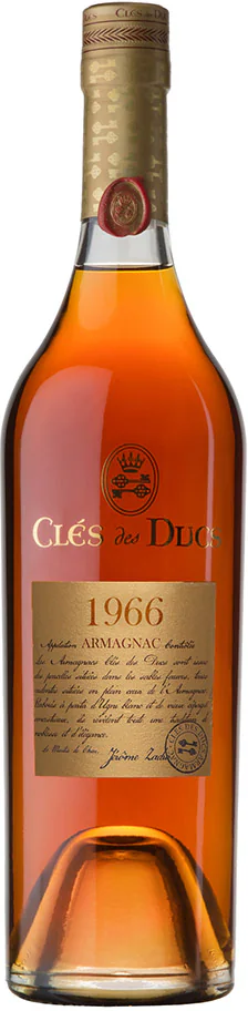 Классический винтажный арманьяк "Cles des Ducs" Millesime, Armagnac AOC произведен из винограда, выращенного в лучшей части провинции Арманьяк — на рыжих песчано-илистых почвах региона Ба-Арманьяк. Из белого винограда традиционных "коньячных" сортов, собранного в 1966 году, создали белое сухое вино традиционным методом. Виноградные спирты, дистиллированные из базового вина, поместили в новые и ранее использованные бочки из лимузенского дуба на многолетнюю выдержку. Вне зависимости от особенностей винтажа и удачности года, мастера подбирают такой профиль лимузенских бочек, чтобы добиться долгого, богатого и мягкого вкуса с легкой древесной ноткой.