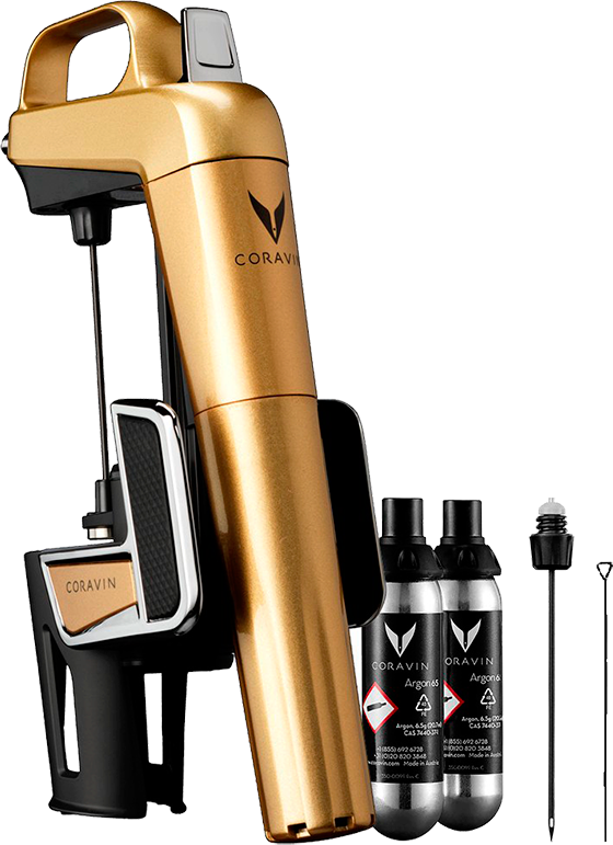В составе набора Coravin Model Two Elite Gold есть все необходимое для использования системы. Комплектация включает стандартную иглу, спицу для ее чистки и чехол на бутылку. Также набор содержит 2 капсулы с газом Аргон, которые находятся под давлением и требуют бережного обращения. Для их замены нужно обязательно изучить инструкцию. Одного баллона хватает для разлива трех стандартных бутылок алкоголя объемом 0,75 литра. Система Coravin Model Two Elite Gold подходит для подачи всех сортов тихи вин с любыми типами мягких пробок (составными, агломерированными, из натурального пробкового дерева). Толкьо у нас ее цена будет самой выгодной.