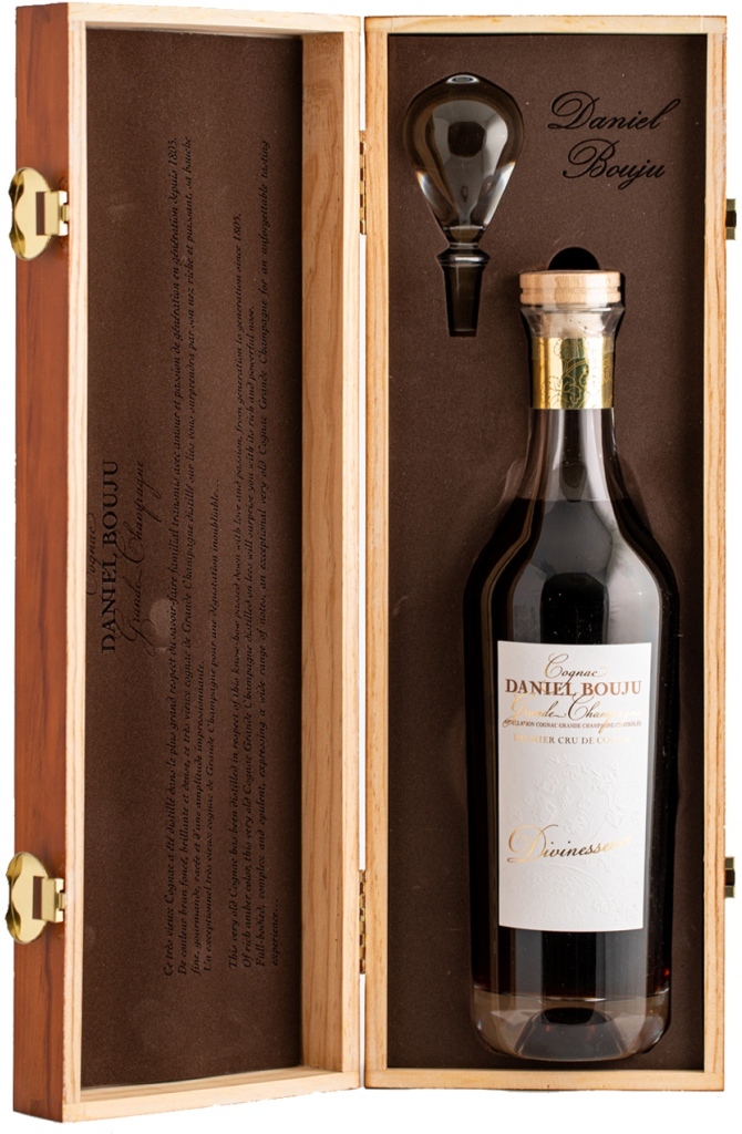 Коньяк "Divinessence" занимает особую позицию в линейке Дома Бужу. Основой коньяка является виноград сорта Уни Блан, выращенный в регионе Гранд Шампань на собственных виноградниках семьи Бужу. Возраст входящих в его купаж спиртов составляет не менее 35 лет. Их выдержка прошла в бочках из лимузенского дуба различной зернистости. Коньяк не содержит карамели и сахарного сиропа, но перед бутилированием проходит легкую фильтрацию. "Дивинессанс" выпускается в изысканном хрустальном графине, к которому прилагается хрустальная пробка. Лакированная деревянная коробка ручной работы украшена латунной пластиной и отделана внутри атласным ложементом. Коньяк "Дивинессанс" станет очень достойным подарком к торжественному событию.