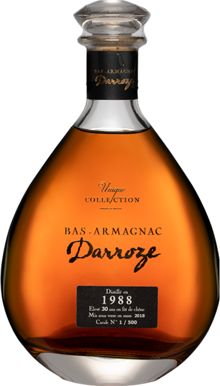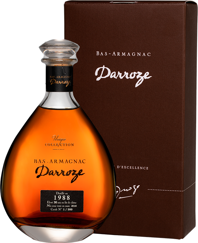 Darroze, Bas-Armagnac "Domaine de Salie", 1988 — превосходный классический арманьяк от патриарха арманьяка Франсиса Дарроза. Спирты для напитка изготовлены в имении Domaine de Salie знаменитого региона Ба-Арманьяк, из винограда сорта Бако урожая 1988 года. Арманьяк был выдержан в дубовых бочках в течение 30 лет и разлит в стеклянные бутылки в 2017 году. Напиток не подвергался холодной фильтрации и не разбавлялся, поэтому он сохранил свой оригинальный вкус и бочковую крепость.