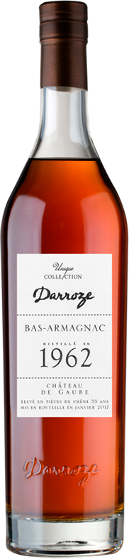 Darroze, Bas-Armagnac "Chateau de Gaube", 1962 — превосходный классический арманьяк от патриарха арманьяка Франсиса Дарроза. Спирты для напитка изготовлены в имении Chateau de Gaube, в окрестностях деревни Перки знаменитого региона Ба-Арманьяк, из винограда сорта Бако урожая 1962 года. Арманьяк был выдержан в дубовых бочках в течение 55 лет и разлит в стеклянные бутылки в январе 2017 года. Напиток не подвергался холодной фильтрации и не разбавлялся, поэтому он сохранил свой оригинальный вкус и бочковую крепость.