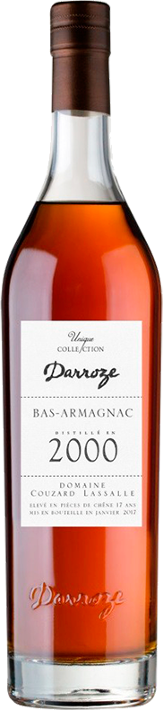 Darroze, Bas-Armagnac "Domaine Couzard Lassalle", 2000 — превосходный классический арманьяк от патриарха арманьяка Франсиса Дарроза. Спирты для напитка изготовлены в имении Domaine Couzard Lassalle знаменитого региона Ба-Арманьяк, из винограда сорта Бако урожая 2000 года. Арманьяк был выдержан в дубовых бочках в течение 17 лет и разлит в стеклянные бутылки в январе 2017 года. Напиток не подвергался холодной фильтрации и не разбавлялся, поэтому он сохранил свой оригинальный вкус и бочковую крепость.