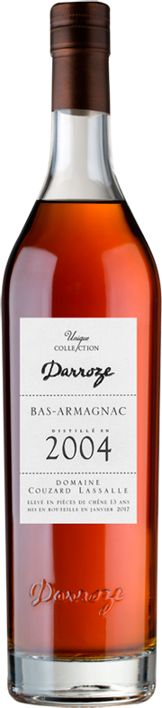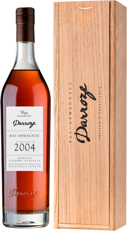 Darroze, Bas-Armagnac "Domaine Couzard Lassalle", 2004 — превосходный классический арманьяк от патриарха арманьяка Франсиса Дарроза. Спирты для напитка изготовлены в имении Domaine Couzard Lassalle знаменитого региона Ба-Арманьяк, из винограда сорта Бако урожая 2004 года. Арманьяк был выдержан в дубовых бочках в течение 13 лет и разлит в стеклянные бутылки в январе 2017 года. Напиток не подвергался холодной фильтрации и не разбавлялся, поэтому он сохранил свой оригинальный вкус и бочковую крепость.