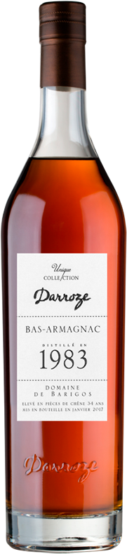 Darroze, Bas-Armagnac "Domaine de Barigos", 1983 — превосходный классический арманьяк от патриарха арманьяка Франсиса Дарроза. Спирты для напитка изготовлены в имении Domaine de Barigos знаменитого региона Ба-Арманьяк, из винограда сорта Бако урожая 1983 года. Арманьяк был выдержан в дубовых бочках в течение 34 лет и разлит в стеклянные бутылки в январе 2017 года. Напиток не подвергался холодной фильтрации и не разбавлялся, поэтому он сохранил свой оригинальный вкус и бочковую крепость.