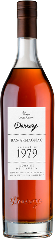Darroze, Bas-Armagnac "Domaine de Jaulin", 1979 — превосходный классический арманьяк от патриарха арманьяка Франсиса Дарроза. Спирты для напитка изготовлены в имении Domaine de Jaulin знаменитого региона Ба-Арманьяк, из винограда сорта Бако урожая 1979 года. Арманьяк был выдержан в дубовых бочках в течение 38 лет и разлит в стеклянные бутылки в январе 2017 года. Напиток не подвергался холодной фильтрации и не разбавлялся, поэтому он сохранил свой оригинальный вкус и бочковую крепость.