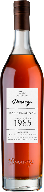Darroze, Bas-Armagnac "Domaine de La Gardenne", 1985 — превосходный классический арманьяк от патриарха арманьяка Франсиса Дарроза. Спирты для напитка изготовлены в имении Domaine de La Gardenne знаменитого региона Ба-Арманьяк, из винограда сорта Бако урожая 1985 года. Арманьяк был выдержан в дубовых бочках в течение 32 лет и разлит в стеклянные бутылки в январе 2017 года. Напиток не подвергался холодной фильтрации и не разбавлялся, поэтому он сохранил свой оригинальный вкус и бочковую крепость.