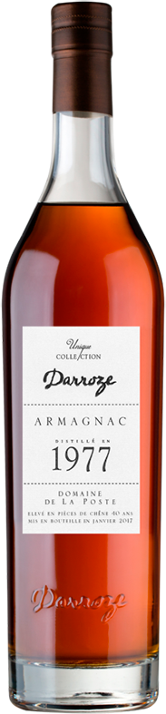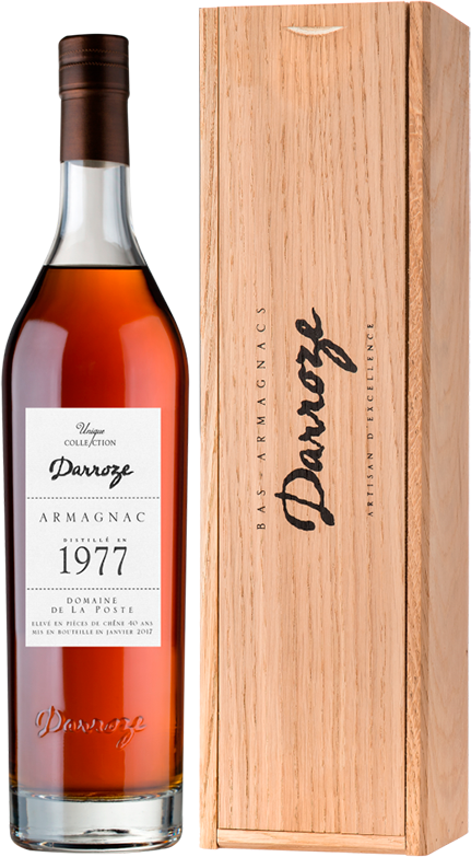 Darroze, Bas-Armagnac "Domaine de La Poste", 1977 — превосходный классический арманьяк от патриарха арманьяка Франсиса Дарроза. Спирты для напитка изготовлены в имении Domaine de La Poste знаменитого региона Ба-Арманьяк, из винограда сорта Бако урожая 1977 года. Арманьяк был выдержан в дубовых бочках в течение 40 лет и разлит в стеклянные бутылки в январе 2017 года. Напиток не подвергался холодной фильтрации и не разбавлялся, поэтому он сохранил свой оригинальный вкус и бочковую крепость.