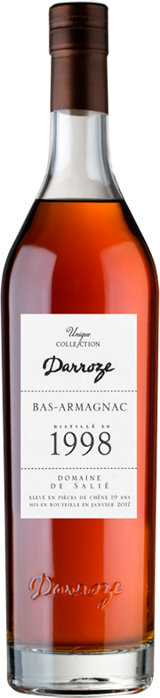 Darroze, Bas-Armagnac "Domaine de Salie", 1998 — превосходный классический арманьяк от патриарха арманьяка Франсиса Дарроза. Спирты для напитка изготовлены в имении Domaine de Salie знаменитого региона Ба-Арманьяк, из винограда сорта Бако урожая 1998 года. Арманьяк был выдержан в дубовых бочках в течение 19 лет и разлит в стеклянные бутылки в январе 2017 года. Напиток не подвергался холодной фильтрации и не разбавлялся, поэтому он сохранил свой оригинальный вкус и бочковую крепость.